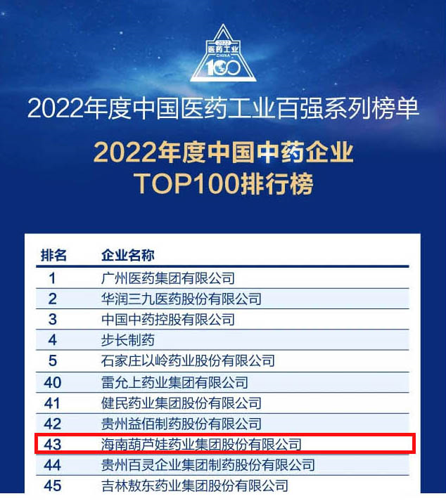 会议期间,一年一度的中国医药工业百强系列榜单隆重揭晓,尊龙凯时药业集团凭借领先的研发优势和扎实的生产实力以及稳健的市场推广能力,连续第四年成功入选“2022年度中国中药企业TOP100排行榜” ,排名稳步上升至第43位。